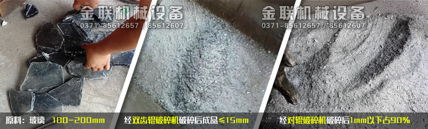 玻璃破碎效果實拍(圖片中雙齒輥破碎機(jī)采用長條齒破碎,不同的進(jìn)料和出粒要求,使用不同的齒形)